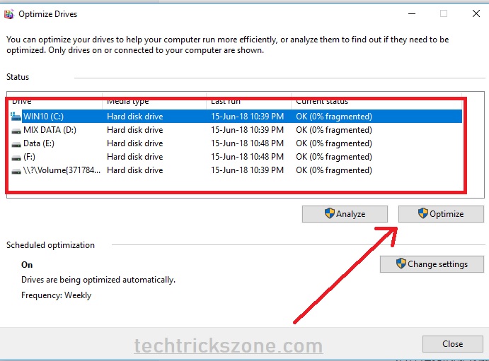 Click the Analyse button and after analyze process press optimize button to start to the defragment process.