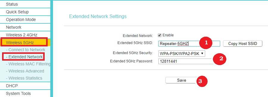 1: Extended 5 GHz SSID: Type WiFi name for Repeater 5 GHz. If you want to use the same WiFi name as main Wifi router use Copy Host SSID option