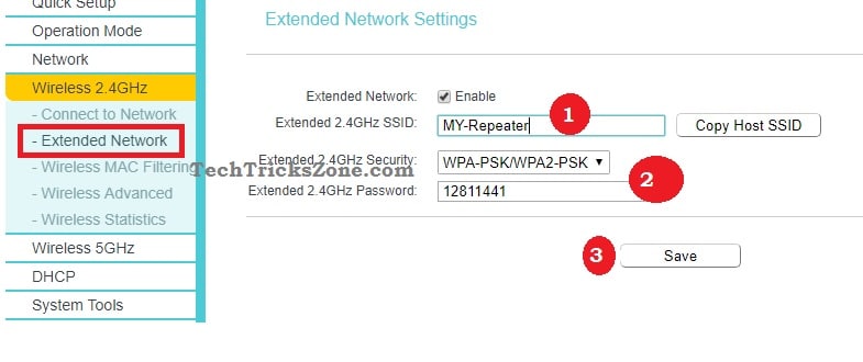 1: Extended 2.4 GHz SSID: Type WiFi name for Repeater 2.4 GHz. If you want to use the same WiFi name as main Wifi router use Copy Host SSID option