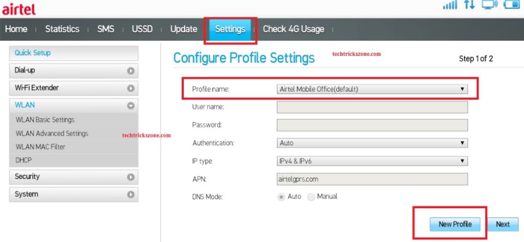 for profile settings go to Settings top from top menu see below Default Profile settings for Airtel 4G hotspot device.