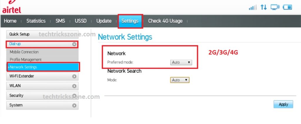 Airtel 4G hotspot Mobile Network Selection 2G/3G/4G and Auto