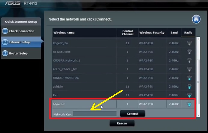 Choose your Main WiFi name and type the password to connect it from the Asus Repeater device.