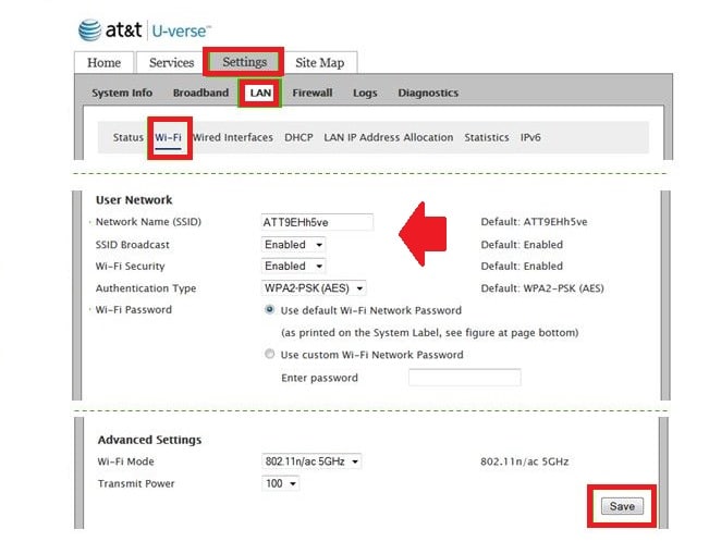 Transmit Power: 100 (you can adjust transmit power as per area size you want to use att router)