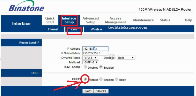 Step2: Disable DHCP Server on Binatone DT850 ADSL Modem + Router.