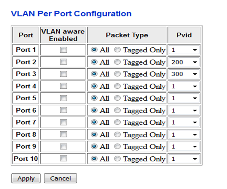 In this step, you have to choose the PVID for each port. see the Port list and select PVID from last option choose from drop list you will see all VLAN ID added.