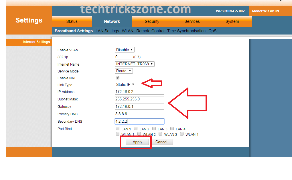 This mode is for if your internetwork with Static IP Address. You required IP Address details given from your internet service provider. If have all details about IP Address follow given steps to the configuration of your Binatone WR3010 Router in Static Mode.