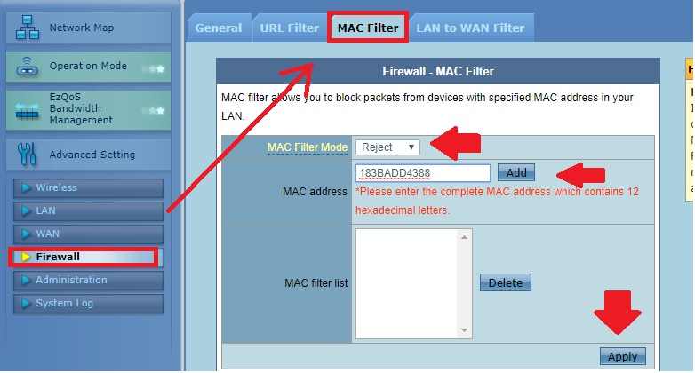 Go to Firewall- Mac Filter