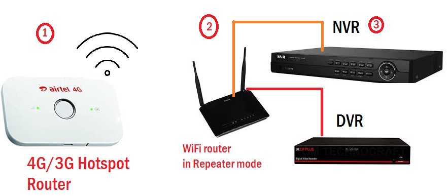 Once your WiFi repeater device is successfully connected to your 4G hotspot router now place the WiFi device near your DVR or NVR and follow the steps as shown below image.
