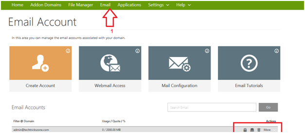 1. After Login cPanel clicks on Email option from the top of go daddy account.