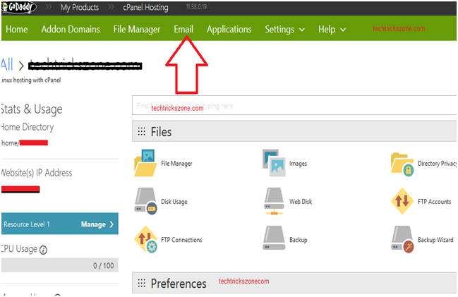 2. Click on Email from the Top menu of go daddy Cpanel account.