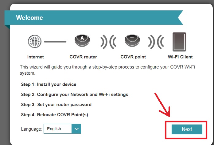 You will get setup wizards steps to configure Covr WAN, WiFi and admin passwords.