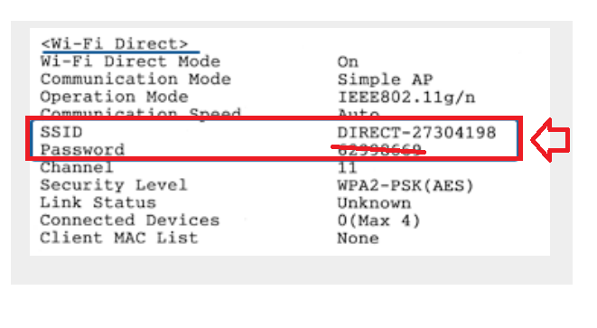You will get a network status sheet with printer hardware and Wireless configuration details. See the sample network status sheet below to find your Wi-Fi direct password to connect from mobile.
