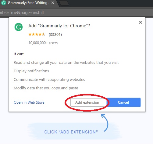 After press Add to Chrome button you will get a pop-up window to ask permission to install Grammarly on your PC.