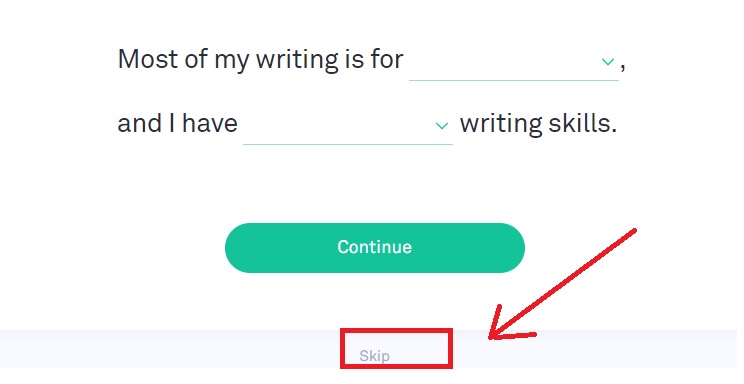 Step 3: Fill the lines with your skills and purpose to use Grammarly spell correction and press continue. You can press Skip option if you don’t want to give information.