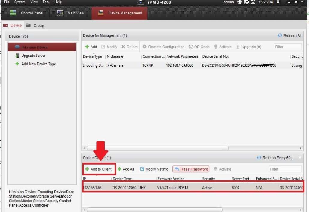 Press Add to the client button to add the camera.