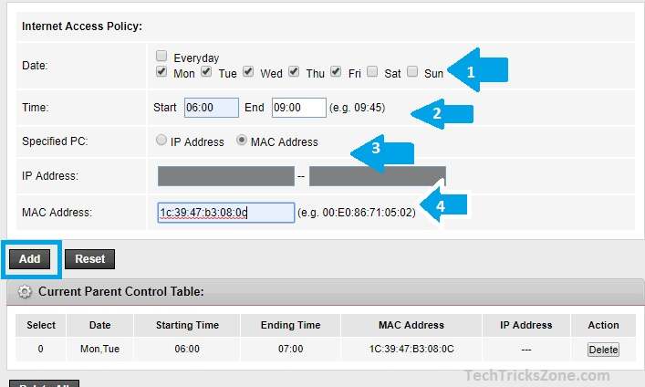- Mac Address: Type the Mac address of your kids Mobile/Desktop.