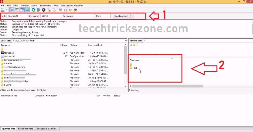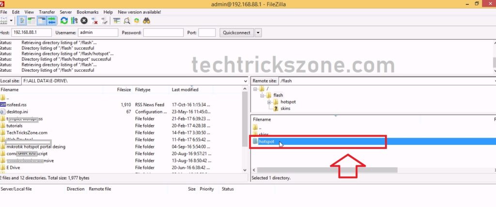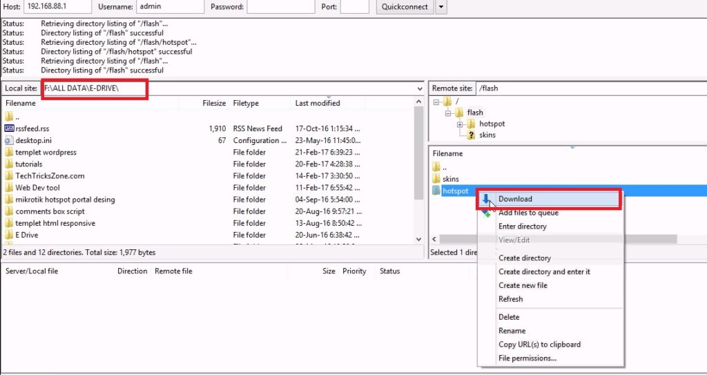 Open Filezilla FTP client software and connect the Mikrotik router flash folder.