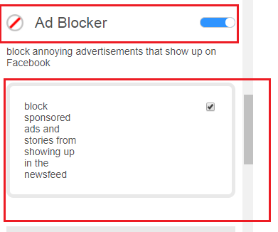 Ad Blocker: Move the button to right will Enable the Ad blocker for your Facebook.