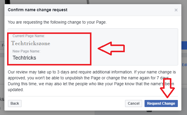 Please check your new FB page name for final confirmation before sending the request to Facebook.
