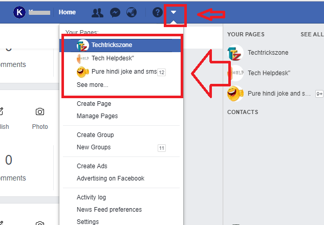 Click on setting down arrow and click the page name. You can also directly go to from right side page list inside YOUR PAGES.