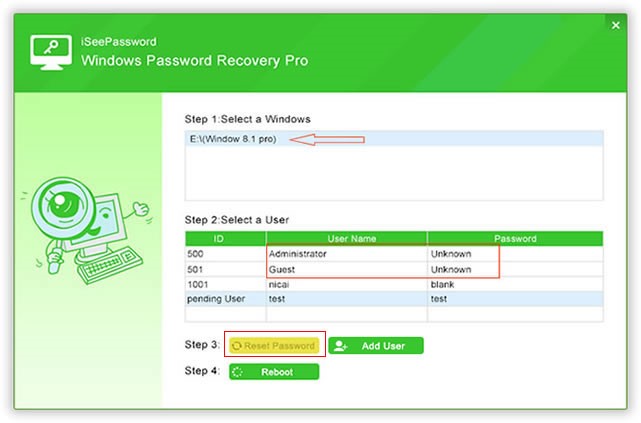 Step-4: Once you’ve completed the above steps, the iSeepassword dialog box appears on your computer screen after you reboot, you can find the locked username and password, then click the “reset password ” button ,