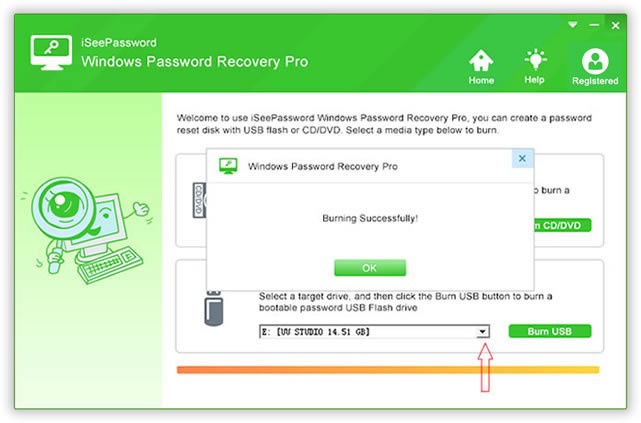 Step-2: Make a bootable disk with DVD/CD or USB (Here’s an example of a USB), Plug an empty USB flash drive into your computer and click on the iSeepassword’s logo on your desktop .then select “Burn USB”options, you need to burn the ISO image files to USB flash drive to make a bootable disk.