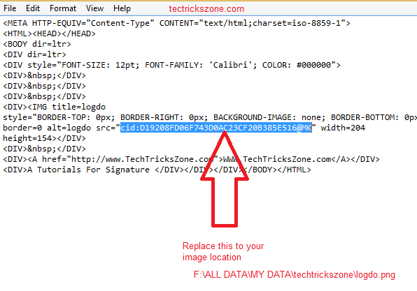 Change File Location src=”cid:01E26DBA01944FE7BDABA13B58ABCA1B to your file location src=”F:\ALL DATA\MY DATA\techtrickszone\logdo.png”