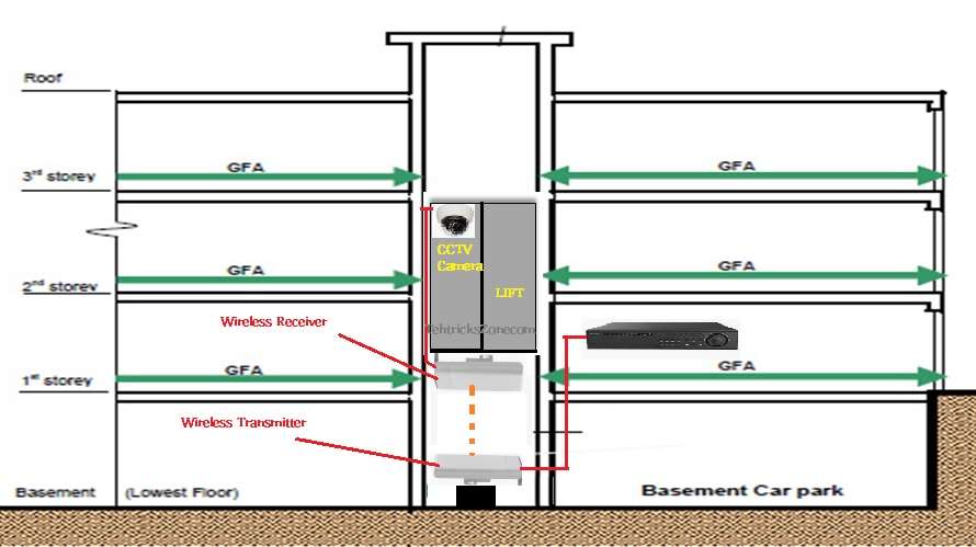 The second way to mount the wireless device at the bottom of an elevator shaft. If you’re NVR and Display installed in the basement or the nearest path is from the basement then use this method. Follow the below image to understand how to install the CCTV camera diagram which will give you clear ways to install IP camera in elevators.