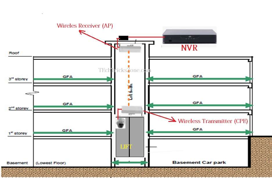 This method can use if the feasibility of NVR and network switch easy reachable from the wireless transmitter device. Using wireless Access Point and Wireless CPE device turn your wired camera into wireless which can possible to fix in an elevator without wiring challenge.