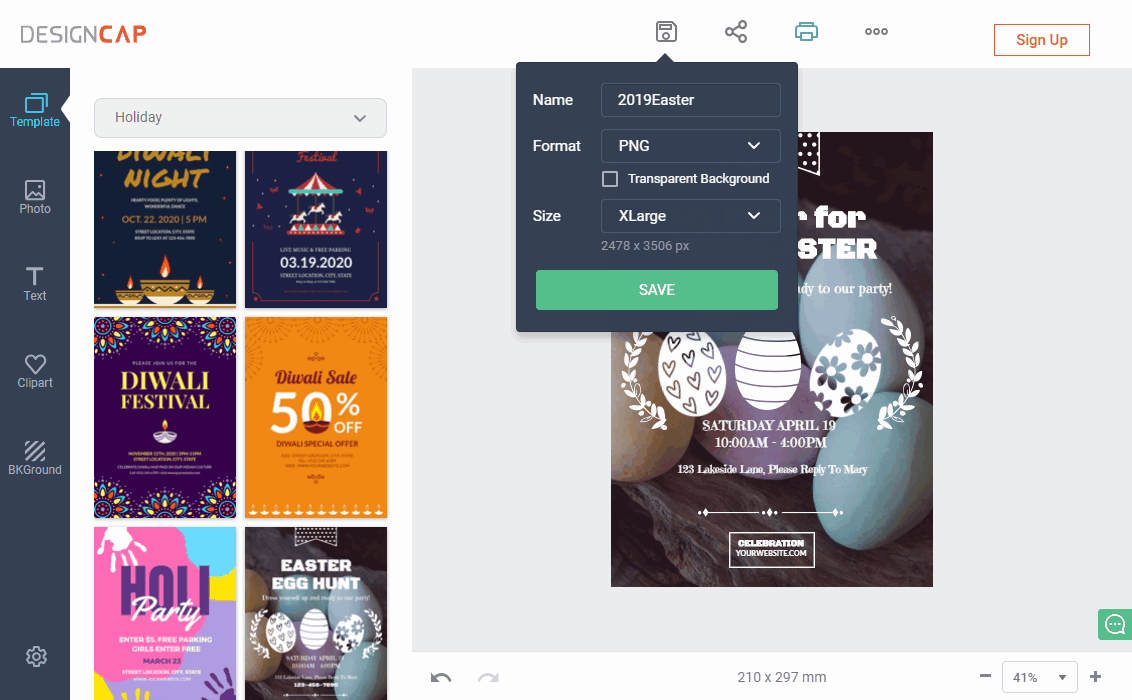 Step Four, Download your flyer for free. When finishing flyer design, you can go the save botton on the top. It will present you 4 resolution options: Small – 793px * 1122px, Medium – 1239px * 1753px, Large – 1652px * 2337px, XLarge – 2478px * 3506px. 3 formats available – JPG, PNG & PNG-transparent.