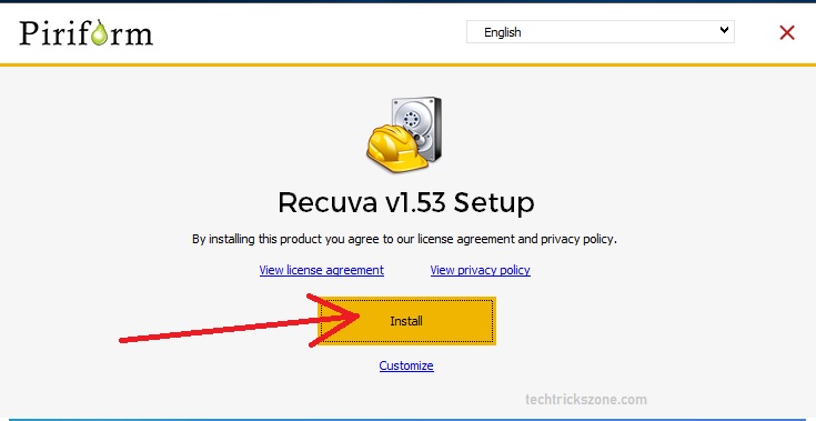 Click the install button to Recuva v1.53 Setup