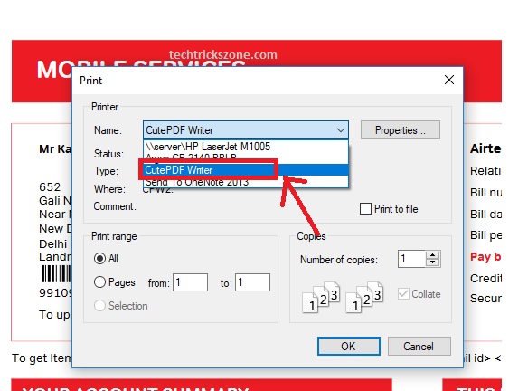 Now click on the printer name and choose the “CutePDF Writer” from the list.