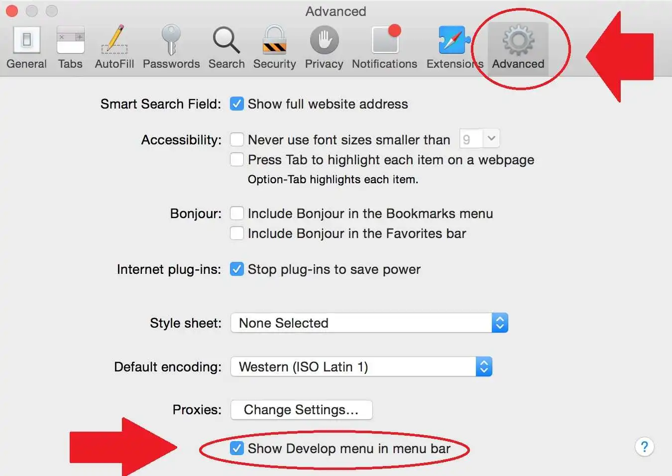 - Go to the Advanced tab and check Show Develop menu in menu bar.
