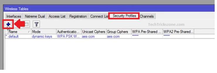 Click + Button to create a new security profile for Mikrotik Virtual AP.