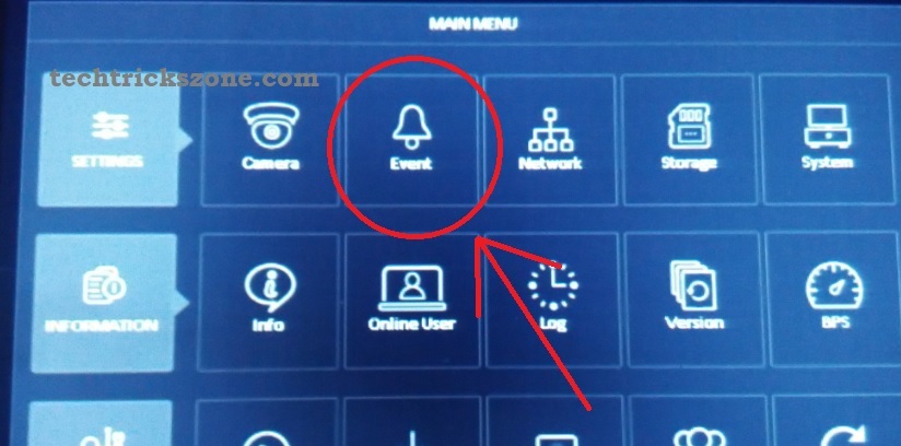 Click the Event (bell icon) option to enter CP plus DVR notification settings