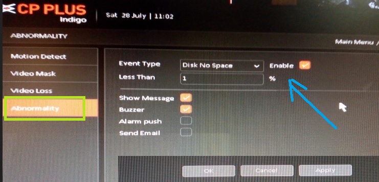 How to disable Disk No Space Alarm Event type in CP Plus DVR and NVR