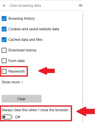 ON the button of “Always clear this when I close the browser“