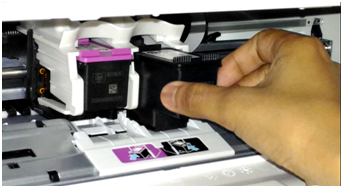After Printer Power on Cartridge Installation Assembly will automatically come to the middle just see the color label of cartridge mention in cartridge assembly. Insert color cartage in color sticker side and black cartridge in back sticker side. After cartridge installation just closes the printer door.