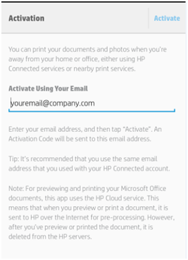 After Installation of HP-ePrint Application Required Activation to use for printing feature. You should have a valid email ID to activate hp eprint application in your mobile. You will get the activation code in your email id.