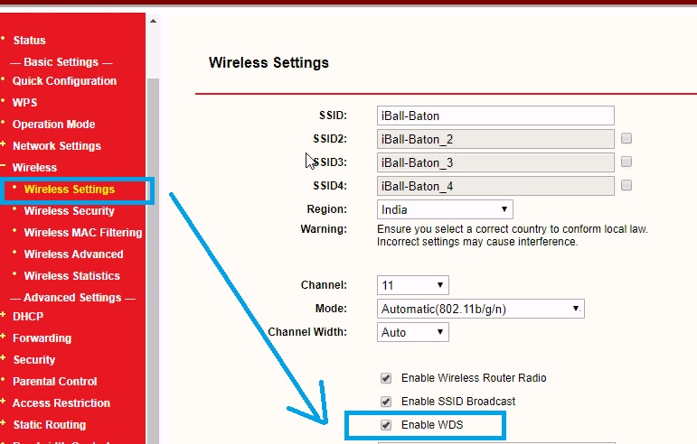 To connect Repeater mode from IBall router now enable the WDS mode to join another access point wirelessly.