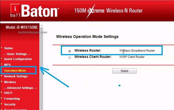 To use the IBall N300 wireless router as the universal repeater to extend the wifi signal first need to change operation mode with “Wireless Broadband Router”.