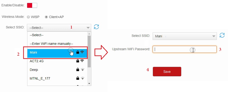 Select SSID– after choosing Client +AP mode wifi router will scan for your main wifi router.