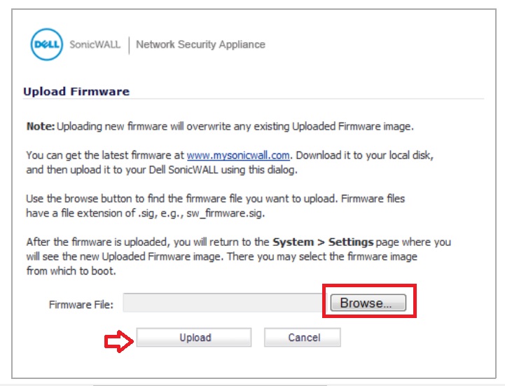• Press the browse button and select firmware downloaded from Sonicwall downloads.