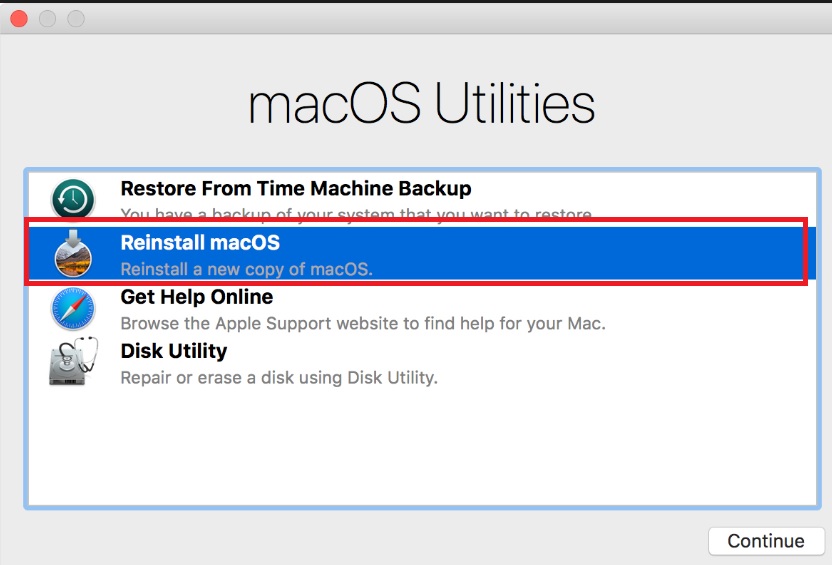 Select the Reinstall macOS option from the macOS utility menu list.