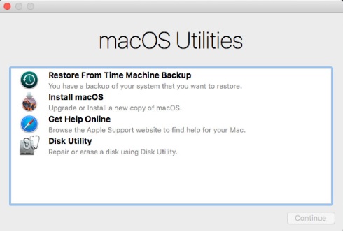 Select the “Disk Utility” and press the Continue button below.