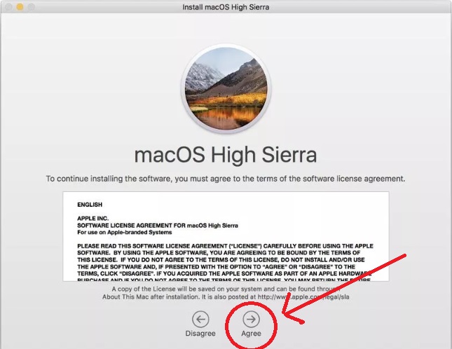 This step will for the Software license Agreement for macOS High Sierra.