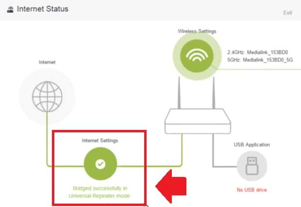 Re- Login Medialink router again and see the status page showing wireless repeating status up in green color as shown below image.
