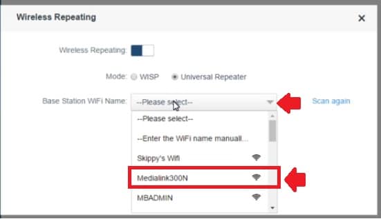 Find your main Host AP name to connect from Medialink repeater device.