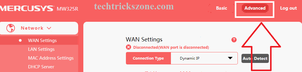 After login in basic main page click the advance option for entering in LAN and wireless settings.