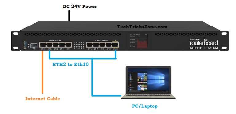 Connect Ethernet 1 to Internet Cable coming from Internet providers. Connect the Laptop/Desktop LAN port to any from Ethernet 2 to Ethernet 10.